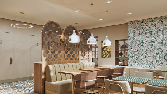 The interior features turquoise tones, traditional tilework and soft furnishings to reflect Turkish hospitality. With its bright, elegant layout and inviting seating, it showcases how London café interior design can create an authentic, welcoming experience developed in collaboration with UNAS.